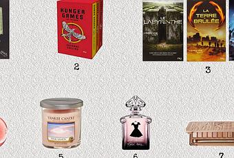 1) "Saccage ce carnet" de Keri Smith2) Trilogie "Hunger Games" de Suzanne Collins3) Trilogie "Le Labyrinthe" de James Dashner4) Parfum "Rêve Elixir" de Van Cleef & Arpels5) Bougie Yankee Candle6) Parfum "La petite robe Noire" de Guerlain7) Palette Naked 3 de Urban Decay