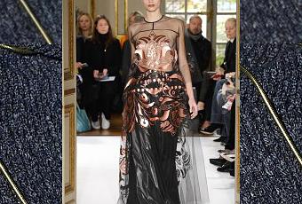 De nouvelles formes et coupes ont été imaginées. Les pièces maîtresses de la collection comprennent une robe en forme d’entonnoir avec un t-shirt blanc d’hommes, ainsi qu’une robe florale noire et blanche en satin ou encore un poncho ivoire à sequins.