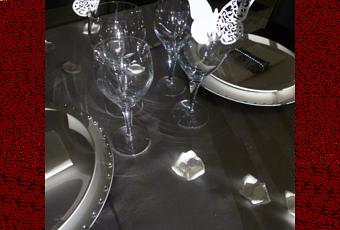 Etant donné que j'ai un mur de couleur prune, j'ai préféré ne dresser la table qu'avec du gris argenté et du blanc pour un effet moderne, tout en ajoutant des papillons en plume et des pétales de roses en tissu blanc pour garder un esprit romantique.