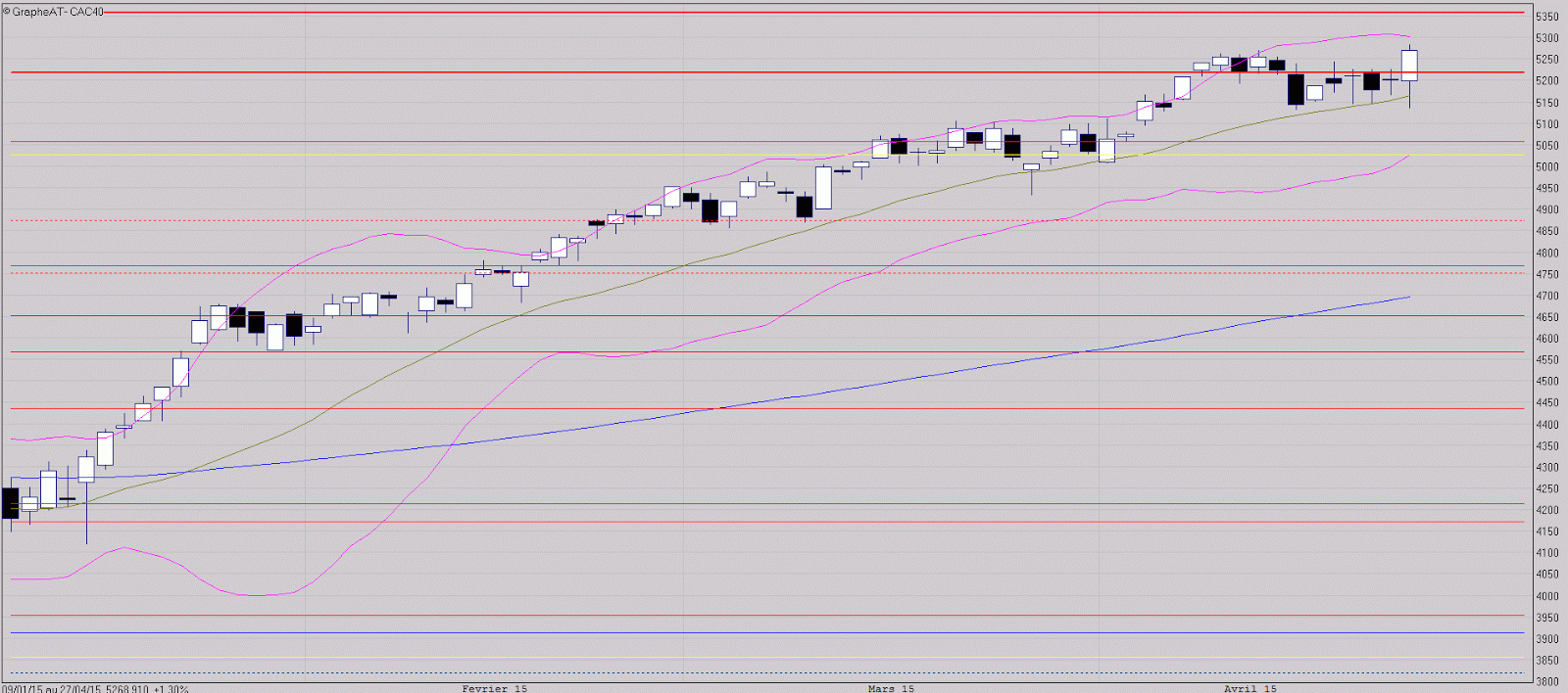 Je parlais dans l'analyse de vendredi dernier des difficultés que pouvait rencontrer le marché face aux négociations avec la Grèce (la séance s'était soldée par la formation d'un doji, signe d'attentisme, mais sans agitation à la veille du week end) Aujourd'hui, un nouveau record annuel a été atteint en séance, signe que malgré quelques déclarations négatives, un accord sera vraisemblablement trouvé. La bougie blanche formée aujourd'hui franchit nettement la résistance des 5218 points, mais ne permet pas encore de faire sortir le marché de sa phase d'hésitation dans laquelle il évolue depuis plusieurs semaines. Il faudra donc confirmer ce franchissement par une clôture au-dessus des 5270 points afin de relancer la hausse vers le prochain objectif des 5360 points.