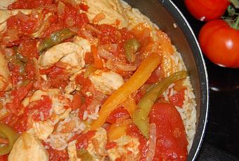 Ce plat est composé de morceaux de poulet sautés, puis mijotés en cocotte avec un mélange de tomates mûres et de poivrons rouges et vert. L’ail, l’oignon et le piment d’Espelette relèvent le plat (source Wikipédia).