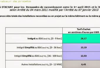 Les tarifs d'achat pour la période du 1er avril 2015 au 30 juin 2015 ont été déterminés par la CRE et devront être validés par arrêté ministériel.