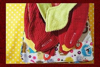 Pour les tissus, j’ai utilisé du nid d’abeille rouge et du jaune pour l’arrière, acheté au magasin Tissus Jaurès d’Orléans. Y’en a qu’un seul que j’ai fais en éponge verte acheté à Mondial Tissu.