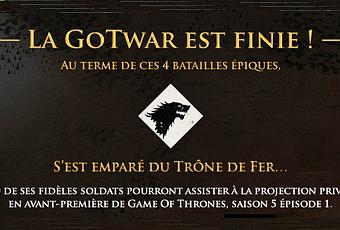 Une semaine avant le début de la saison 5, les twittos et certains influenceurs fans de Game of Thrones, ont été mis à contribution pour se mener une véritable guerre et ce pendant 4 jours. A la clé pour l’armée victorieuse ? Pas un royaume mais presque… une place pour l’avant-première privée du premier épisode de la nouvelle saison, avant sa sortie aux US ! Quand on sait que la série est celle qui a été la plus téléchargée illégalement ces dernières années, que le premier épisode de la saison 5 a une nouvelle fois battu des records avec 13 millions de téléchargement et que les français ont été les deuxièmes, après les américains, à le pirater… on pouvait s’attendre à ce que l’opération soit un succès… et ce fut le cas !
