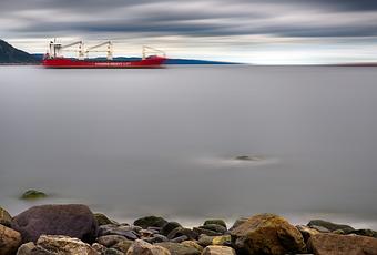 Sur cette photo, le léger déplacement du bateau le rend flou, c’est normal. La montagne au fond et les rochers au premier plan sont parfaitement nets.