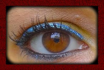 - de l'oxyde jaune sur la paupière mobile (au pinceau plat humide) - les micas bleu profond en liner épais au ras des cils (au pinceau biseauté humide) - une touche de long lasting ivoire estompé au doigt au dessus de la paupière. - du crayon noir dans la waterline - du mascara noir sur les cils supérieurs