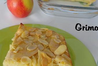 Dans un moule légèrement beurré et fariné, verser la moitié de la préparation, puis déposer les tranches de pommes et couvrir avec le reste de la préparation. Faire cuire au four pendant 20 mn.
