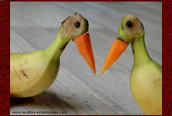 En tout cas, je me suis bien amusée à les fabriquer, c’est tout simple, il vous faut 2 bananes, 1 carotte, des cures dents et pour les yeux des grains de poivre.