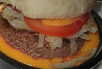 Placez dessus le steack cuit selon votre goût, on rajoute la garniture de son choix dessus, pour nous se sont oignons fondus, tomates,et cheddar fondu.
