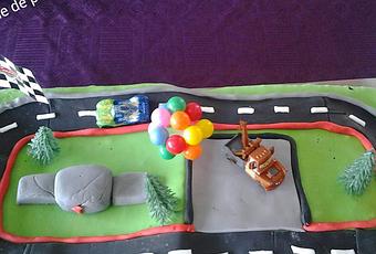 Décoration : 1- A l'aide d'un rouleau à pâtisserie étalé sur un plan de travailler recouvert de sucre glace votre pâte à sucre vert en rectangle de la dimension de vos 2 gâteaux. Attention un peu plus grand, car il faut qu'elle recouvre les côté aussi. 2- Une fois étalée déposer la pâte sur vos gâteaux. Attention en la manipulant pas qu'elle se déchire faite vous aider si besoin. 3- Prendre un cutteur et découper tout ce qui dépasse. 4- Prendre votre pâte à sucre noir et l'étaler découper à l'aide d'un cutteur les formes de vos routes et les badigeonner de colle alimentaire et les déposer sur le gâteau. (garder en un peu pour former un boudin pour le parking) 5- Etaler la pâte à sucre blanche et découper des rectangles de 1 cm de large par 2 cm de long. Les badigeonner de colle alimentaire et les déposer au centre de la route. 6- Prendre 1/3 de la pâte à sucre grise formé des boudins que vous roulerez sur la paume de vos mains. Badigeonner les de colles alimentaire et les mettre le long du circuit sur l'extérieur. 7- Avec la deuxième partie de gris faire des marches pour faire un podium et les disposer sur le gâteau. 8- Prendre le 3éme bout de gris et l'étaler en un carré, le badigeonner de colle et le disposer sur le gâteau. 9- Prendre le noir réserver et le roulé le badigeonner de coller et le disposer le long du parking gris. 10- Prendre la pâte à sucre rouge et le roulé en boudin et la disposer à l'intérieur le long du parking. S'il vous reste du rouge faire les chiffres 1, 2, 3 et les disposer sur les marches du podium. 11- Prendre les arbres en plastique et les disposer sur les gâteaux. Faire de même avec les voitures. Voilà, j'espère avoir été clair dans mes explications.