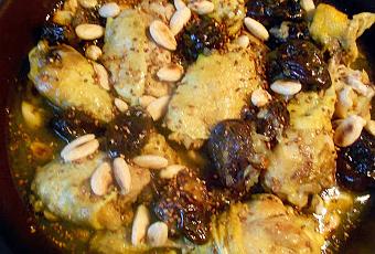 Pour 4/6 personnes : 4 pilons de poulet, 4 hauts de cuisse, 2 gousses d'ail, 2 oignons, 1 filet d'huile d'olive, 1.5 cc de sel, 1/2 cc de poivre, 1/2 cc de curcuma, 1 cc de gingembre en poudre, 1 cc de cannelle en poudre, 20 pruneaux, 70 g d'amandes mondées, 10 g de graines de sésame, 250 ml d'eau.