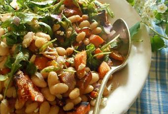 Faire chauffer 2 cuillères à soupe d’huile d’olive dans une poêle et mettez-y les dés de patate douce à cuire jusqu’à ce qu’ils soient tendres. Ajoutez les haricots blancs et l’oignon. Faites chauffer le mélange puis ajoute la roquette, les olives et la feta. Versez l’ensemble dans un saladier, ajoutez l’huile restante et quelques gouttes de vinaigre balsamique. Salez et poivrez puis servez.
