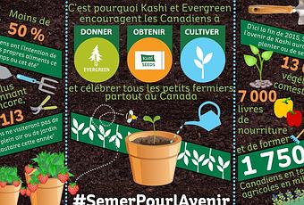 « Nous souhaitons inspirer la prochaine génération de petits fermiers, explique Jenn Carkner, chef de marque principale pour Kashi Canada. C’est pourquoi Kashi a lancé l’initiative Semer pour l’avenir. Au cours des deux dernières années, nous avons fait don de plus de 100 000 $ au programme de jardins en milieux urbains d’Evergreen pour contribuer à l’aménagement et à l’entretien de jardins urbains partout au Canada dans le but d’offrir à des collectivités dans le besoin une chance de se rapprocher des vrais aliments. Nous rendons également la tâche facile aux Canadiens qui souhaitent s’impliquer dans le projet en insérant des semences potagères biologiques dans les boîtes spécialement identifiées de céréales et de barres Kashi. En cette saison du jardinage, n’importe qui peut donc rejoindre le mouvement et faire pousser quelque chose de délicieux. »