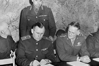 C'est en réalité le 7 mai 1945 à 2h 41 que fut signé à Reims, au QG du général D. Eisenhower installé dans le lycée technique de la ville, l'acte de capitulation sans conditions du IIIème Reich, par le maréchal Jodl* et l'amiral von Friedeburg au nom de l'amiral Dönitz, successeur d'Hitler qui s'est suicidé dans son bunker de la chancellerie de Berlin le 30 avril. La France n'assiste à la signature qu'en qualité de témoin.