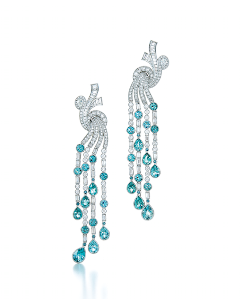 Les teintes de bleu (tourmalines, turquoises, aigues-marines), les perles de culture et l’agencement des diamants rappellent les mouvements des vagues.