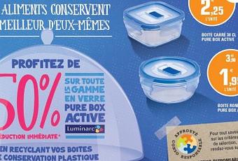 Rapportez une boite de conservation en plastique à l’accueil de l’hypermarché, et recevez en échange un coupon de 50% de remise immédiate à présenter lors de votre passage en caisse pour l’achat d’un produit de la gamme PURE BOX ACTIVE LUMINARC. »