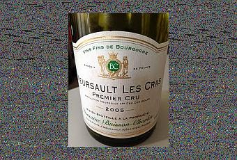 Meursault, Domaine Buisson Charles Les Cras 2005 : Un nez entre 2 eaux, poire avec un coté macérée, note amande, un côté "ambré" sésame, puis aubépine, et en fond un léger beurre et brioche puis craie. La bouche est ronde, ample, matière suave, sur la poire, note sésame marqué, d'amande, d'aubépine, fond de craie, finale ronde belle structure, c'est équilibré de bout en bout. Une persistance intéressante sur la poire, note sésame, fond léger fumé brioche. Loin du gras beurrée boisé, la rondeur est bien compensé par la structure et le côté sésame assez classe étonne et rend ce vin assez original. TB+ 91 16,5 (les notes pralins d'origine ont évolué vers le sésame).