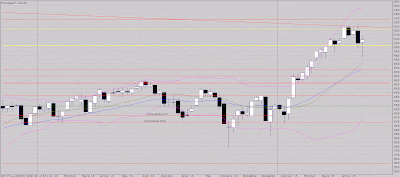 Nous avons vu dans l'analyse d'hier matin, que le marteau formé jeudi avait stoppé la baisse sur le support des 4873 points qui constituait la 1ère cible de la correction. Par rapport à la grande bougie noire formée la semaine dernière qui pouvait annoncer le départ d'une correction plus profonde, le marteau formé cette semaine (bien qu'imparfait à cause de l''ombre haute) reflète une forte réaction haussière. Il faut bien entendu que ce marteau soit confirmé par le dépassement des 5133 points pour que le signal baissier de la semaine dernière soit complètement effacé. Nous assisterons probablement, au cours de la semaine prochaine, au test de son ombre basse et ne sommes donc pas à l'abri d'une rechute dans ces conditions. N'oublions pas à cet égard, que le CAC reste sous l'influence de l'étoile filante formée en avril après une avancée bloquée sur l'unité de temps mensuelle ; l'ensemble de ces figures n'étant pas propice à une reprise de la hausse des derniers mois.