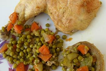 Ajouter dans la marmite l'ail, les carottes, les petits-pois, le curcuma, quelques stigmates de safran ou un sachet de spigol, la coriandre, le sel et le poivre ainsi que les cuisses de poulet avec 1/2 verre d'eau.
