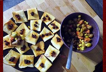 - 1 sachet de champignons "apéro" Tex Mex LOU- 4-5 tanches de pain de mie coupées en 4- quelques tranches de chorizo coupées en morceaux- 2 càs d'olives vertes dénoyautées