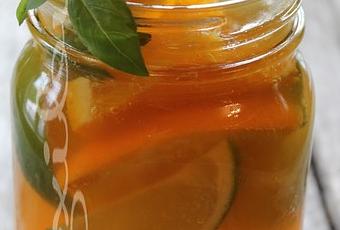 2)Dans 6 pots de type Mason d'une capacité de 500 ml (2 tasses), répartir les litchis (ou boules de melon) et leur sirop, les quartiers de limes, les demi-rondelles d'orange et les feuilles de basilic.