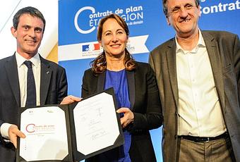 C’est le lundi 4 mai qu’a été signé officiellement le Contrat de Plan Etat - Région 2015-2020 qui détermine les grands axes d’intervention des deux protagonistes sur le territoire et les lignes budgétaires associées. Manuel Valls avait fait le déplacement, accompagné de la Ministre de l’écologie, du développement durable et de l’énergie, Ségolène Royal. Les présidents des Conseils départementaux, parties prenantes notamment des volets transports et numérique du plan étaient associés à la signature, ainsi que les présidents des Communautés d’agglomération.En nette augmentation par rapport au précédent, ce nouveau contrat de plan va mobiliser 982 800 euros (533,2 millions pour l’Etat et 449,6 millions pour la Région) sur 6 ans en Poitou-Charentes (c’est plus qu’en Pays de Loire, région voisine, où l’engagement est de 808 millions d’euros).