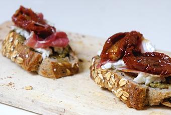 Coupez de fines tranches de pain et passez les au toasteur. Prenez vos pains chauds, tartinez les de pesto, rajoutez quelques bouts de mozza, de fins morceaux de jambon du pays, 1 ou 2 tomates séchées par pain et voila un amuse-bouche qui plaira définitivement aux gourmands !