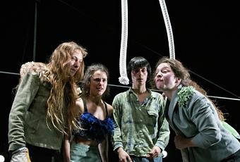 Un mat, une bascule, une corde lisse, un fil de fer : chacune à son instrument de prédilection mais tout se mélange dans un scénario soigneusement huilé. Le meilleur passage à mes yeux : un exercice de contrepoids où la bascule leste la corde lisse pour permettre à nos amazones de grimper. Mais que se passe-t-il lorsque l'une d'entre elles se suspend à la bascule ? C'est techniquement époustouflant mais aussi très réussi sur le plan burlesque.