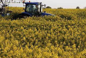 Un paysan épand des pesticides sur un champ de colza à Blecourt, près de Cambrai (Nord), le 10 mai. PASCAL ROSSIGNOL / REUTERS
