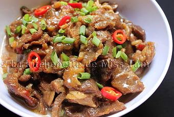 - Dans une casserole à fond épais, faire chauffer deux cuillères à soupe d’huile et deux cuillères à soupe de sucre à feu vif. En deux ou trois minutes, le sucre va se caraméliser et brunir, ajouter aussitôt la viande marinée et faire revenir jusqu’à obtenir une belle coloration. Ajouter les échalotes hachées, une cuillère à soupe de sauce de soja et une cuillère à soupe de jus de citron (c’est ma touche personnelle pour relever le goût de la sauce). Cuire pendant 5 minutes à feu vif.