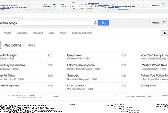 Voici le résultat avec Phil Collins. En cliquant sur un titre, on obtient différents enregistrements disponibles sur YouTube.