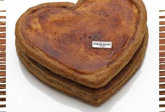 Le coeur puits d’amour est une crème vanille caramélisée au fer, contenue dans une pâte feuilletée, dans un écrin enrubanné de rouge