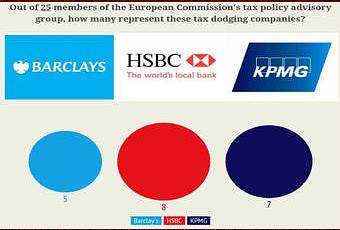 Ils sont trop forts à la Commission. Imaginez un groupe d’experts chargé de lutter contre l’argent sale qui serait trusté par la maffia. On doit à l’excellent « Corporate Europe Observatory » (visitez leur site, mais c’est en anglais) une analyse de la composition du groupe d’experts récemment mis en place par la Commission afin de la conseiller en matière de « politique fiscale », y compris, au moins dans l’affichage, pour freiner l’évasion fiscale, notamment par la transmission automatique de données. Affichage louable, mais la suite prouve que c’est juste du « tax washing ».Voici le schéma qui résume les comptes du CEO. 20 membres de ce groupe sur 25 sont issus de ces trois organismes financiers ou leur sont indirectement liés.