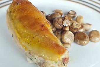 J'ai placé chaque morceau de pintade sur un rectangle de film alimentaire, les ai salés et poivrés, déposé une grosse cuillère de farce, puis roulé fermement. Il faut ensuite bien serrer et attacher les deux extrémités (une deuxième couche de film est conseillé pour consolider le tout).