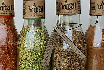Oui, les ami(e)s, l'Homme a reçu en cadeau pas une, mais bel et bien, six imposantes bouteilles d'épices (et j'exagère à peine car les bouteilles sont très grosses). Ces dernières sont produites par la compagnie Vital Grill : les spécialistes par excellence du réchaud et BBQ. Je vous invite à aller voir leur site car je suis certaine que leur produits écologique et design vous séduiront autant que moi (jetez un coup d'oeil sur ce petit bijou de BBQ au bois, ça vaut la peine ;-)).