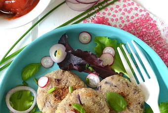 - Façonner à la main des boulettes de pâte et les aplatir quelque peu. Les faire revenir dans une poêle légèrement huilée pendant 2 minutes de chaque côté à feu doux/moyen (attention de ne pas faire brûler l'huile afin qu'elle ne soit pas nocive). Placer les bouchées sur du papier absorbant avant de les servir bien chaudes, accompagnées d'une sauce ketchup maison et d'une salade verte.