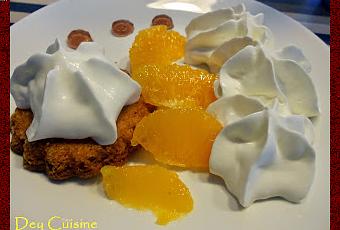 Dans les assiettes déposer un sablé puis répartir des suprêmes d'orange et finir avec de la mousse à la menthe sur le sablé et à coté des morceaux d'orange.