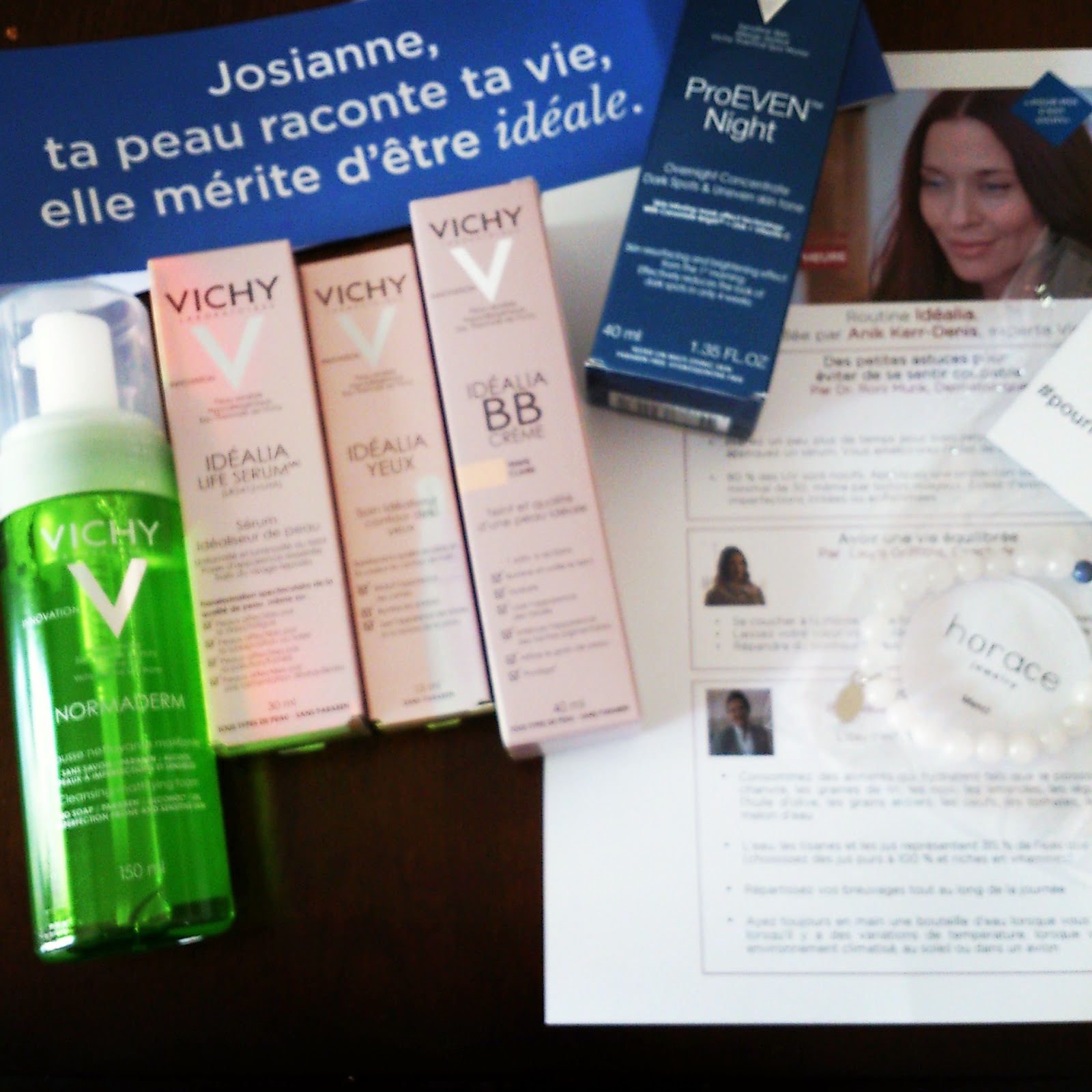Il y a quelques semaines, j'avais soumis aux Experts de Vichy un diagnostic virtuel de ma peau. Après ce fameux diagnostic virtuel, les Experts de Vichy m'ont envoyé un paquet avec une nouvelle routine beauté. J'étais habituée à Normaderm depuis un peu trop long temps, on m'a envoyé des produits Idealia, que j'avais déjà testé et adoré en 2013 et la raison pour laquelle, je n'avais pas continuer avec ces soins, c'est que je les trouvais moins abordables pour mon budget à l'époque que présentement et que Normaderm à ce moment convenant tout aussi bien à ma peau. Dans mon envoie, il y avait un soin proEven Night. Pour moi, c'est Vichy depuis des années. Même si je reçois des dizaines et des dizaines de produits cosmétiques, je vais toujours acheter en pharmacie ou en grande surface les mêmes produits dans lesquels j'ai vraiment confiance et qui marche bien avec ma peau. Je suis ouverte au changement, mais Vichy est une des gammes qui a toujours fonctionné le mieux avec ma peau. Lorsque j'ai reçu ma nouvelle routine, j'étais confiante en avoir des résultats rapidement et c'est ce que j'ai eu.