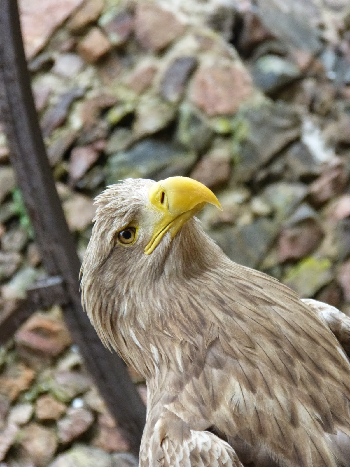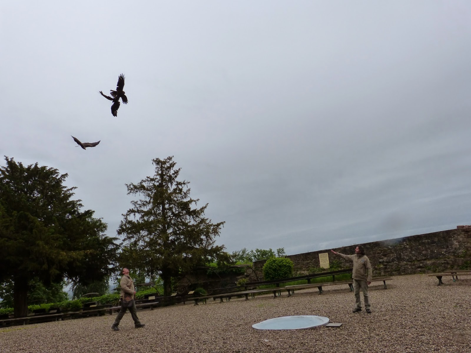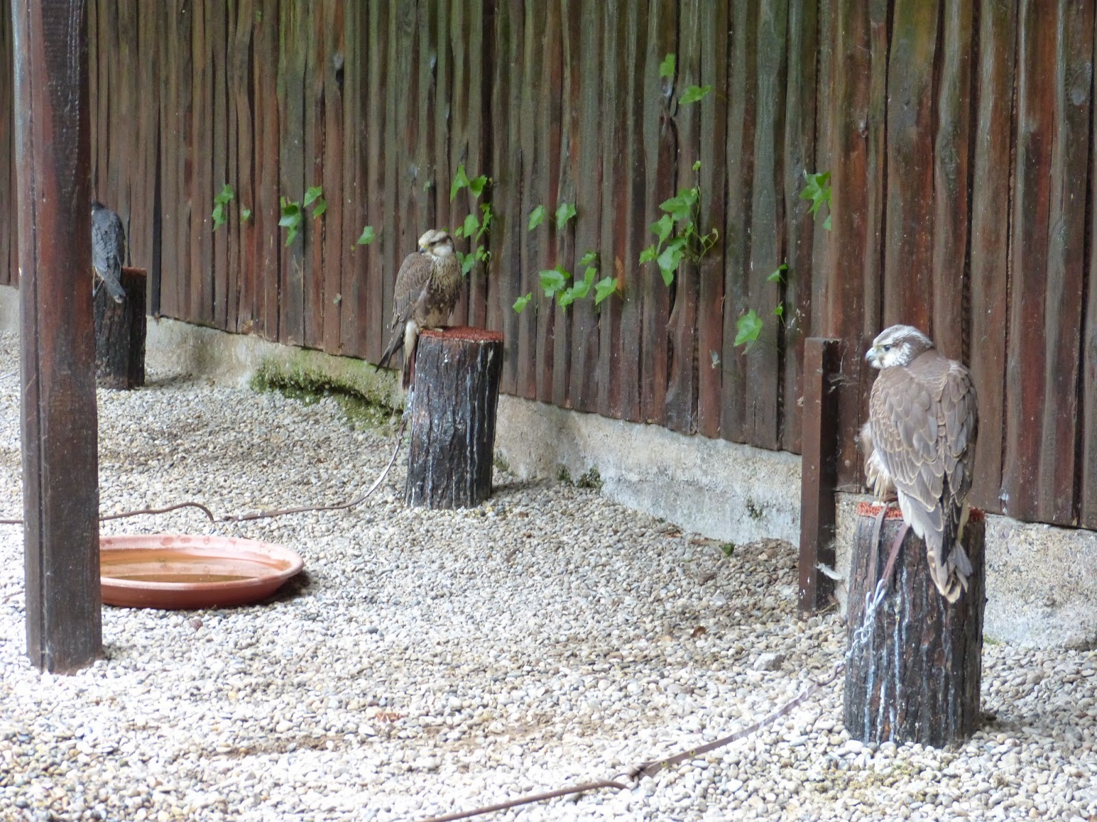 Là encore, il fallu marcher un peu pour atteindre l'entrée d'un château-fort reconstitué. Le cadre était magnifique, à la sortie d'un bois, perché sur les hauteurs.A l'intérieur, à l'heure où nous arrivions, nous avons pu visiter un élevage de rapaces splendides/ Autour de la bâtisse, ceux-ci n'étaient pas prisonniers derrière les barreaux d'une cage, aussi nous avons pu les observer de très près. Le nombre de volatiles dans ce lieu est impressionnant, la volerie étant spécialisé dans l'élevage et la reproduction des ces bêtes dans un lieu qui est leur habitat naturel.