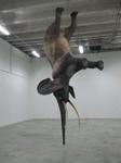 Daniel Firman depuis quelque temps. Cet artiste est un adepte de l’équilibre, de l’envol improbable, de l’apesanteur et il ne nous surprend jamais assez. Ici, un éléphanteau empaillé tient en équilibre sur sa trompe; même pas inquiet, le spectateur s’en approche, téméraire et se met à son ombre. Ce n’est pas seulement une prouesse improbable, c’est un savant calcul gravitationnel : nous serions, pour qu’il en soit ainsi, sur une planète lointaine, des milliers de fois plus petite, donc moins lourde et moins attractive, que la Terre, ce qui fait que les éléphants pourraient y faire le poirier, et les humains s’envoler, je suppose.
