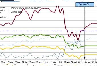 Nous avons roulé la position en conservant le strike à 3300 points. La volatilité étant forte, et le strike peu éloigné, nous gagnerons plus de temps que d'habitude pour le mois de novembre (prochaine échéance: le 18 nov): 45 points dans chaque direction, avec le levier de 2, cela fait 180 points au total !