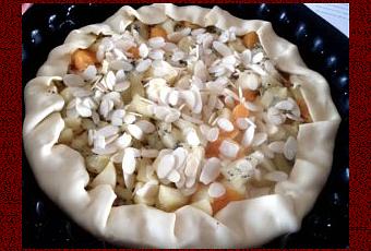 . Etalez la pâte dans un moule à tarte (la piquer à l'aide d'une fourchette), mettre la poudre d'amandes sur la pâte puis les fruits et rabattre le bord de pâte dessus.