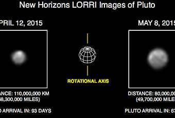 Entre les images capturées à la mi-avril, à quelque 110 millions de km de la planète naine, et celles obtenues entre le 8 et le 12 mai, alors que New Horizons n’était plus qu’à 77-75 millions de km, Pluton a grandi d’environ 50 % dans le champ du télescope Lorri (Long-Range Reconnaissance Imager). Cette dernière série publiée par le JHUAPL (Johns Hopkins University Applied Physics Laboratory) couvre une période de rotation complète de l’astre sur son axe (6,4 jours), offrant ainsi aux planètologues la possibilité de distinguer ses éventuelles différences de luminosité et de contrastes qui pourraient refléter sa géomorphologie.