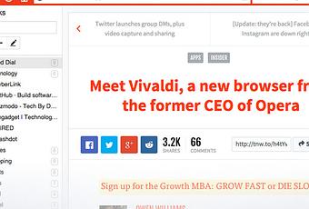 Un navigateur basé sur Chromium, créé par l'ancien capitaine du browser Opera. Une interface moderne, avec en haut à gauche, un bouton pour ouvrir les menus, la barre d'adresses usuelle, munie des boutons traditionnels (home, flèches de navigation, rafraichissement, etc.), une barre latérale permettant d'accéder aux signets, aux téléchargements, à des notes et même dans un futur proche, à un logiciel de messagerie intégré. En bas de page une icône permet d'accéder aux réglages, aux préférences du navigateur.