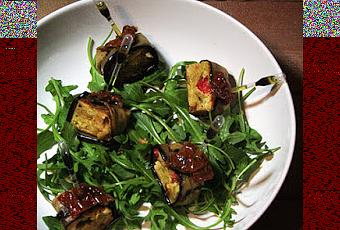10. Rouler une tranche d'aubergine autour d'un cube de tortilla. Déposer sur le dessus un petit morceau de tomate séchée et fermer avec une pipette d'huile d'olive et de vinaigre balzamic.