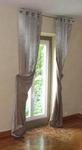 J'ai glissé dans la couture de chacun de ces rideaux à oeillets, une large bande aimantée. Cette confection permet une multitude d'accroches et de draperies sans avoir de fixations murales. L'aimant par son poids et sa souplesse provoque un joli tombé du tissus. Cela permet également une fermeture parfaite des deux panneaux.