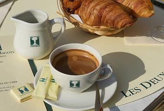 Il est 8h30. Quelques habitués, des messieurs bien mis et une dame au feutre noir, font leur revue de presse. Ici, il y a de quoi : le Monde, le Figaro, Libération… Les nouveaux arrivants – touristes et rendez-vous d’affaires – franchissent triomphalement la porte tambour et prennent place sur les banquettes de moleskine rouge. Dans la grande salle, les tables en acajou attendent les commandes. Le ballet des garçons en habits noirs, long tablier, chemise blanche et nœud papillon peut commencer.