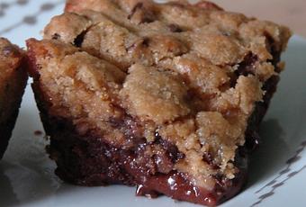 Verser la pâte à cookies par petits tas sur la pâte à brownie (la pâte à cookie ne peut pas être étalée, elle s'enfoncerait dans la pâte à brownie), la pâte s'étendra en cuisant et recouvrira toute la surface)