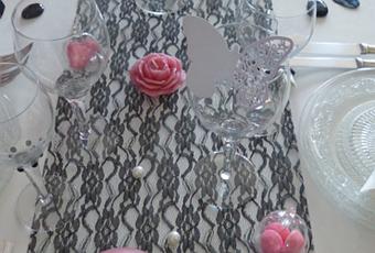 J'ai réalisé une table que j'ai voulu romantique, sur une base de noir et blanc crème, mais pour qu'elle ne soit pas trop "triste" j'ai ajouté quelques touches de vieux rose.
