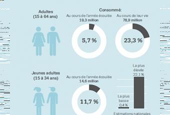 Si près d’un Européen sur 4 a déjà consommé des drogues illicites, la drogue la plus répandue reste le cannabis et pour toutes les tranches d’âge. On estime à 14,6 millions le nombre de jeunes Européens de 15 à 34 ans (11,7 % de cette tranche d’âge) qui ont consommé du cannabis au cours de l’année écoulée, dont 8,8 millions de jeunes entre 15 et 24 ans (15,2 %).